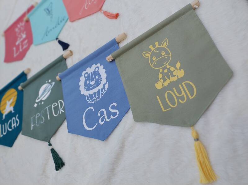 Naast onze vlaggenlijntjes hebben we ook schattige wimpeltjes met naam in het assortiment. Standaard zijn de wimpeltjes ongeveer 20 x 25 cm. Op aanvraag kunnen grotere maten gemaakt worden.