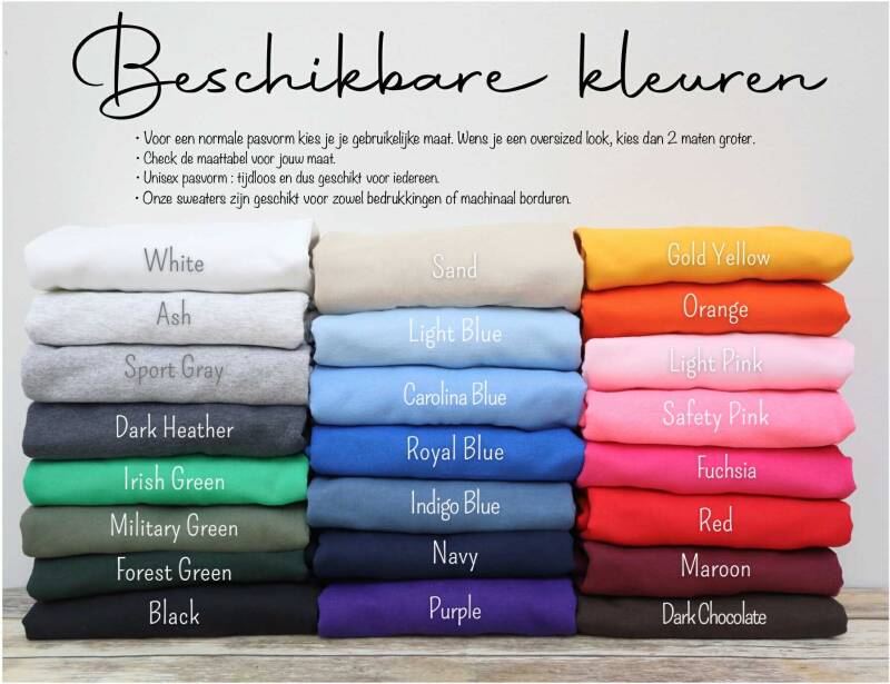 Ontdek onze geborduurde sweaters, perfect voor elke leeftijd! Kies uit onze quotes of kies zelf wat er geborduurd wordt en creëer een uniek kledingstuk. Bekijk de voorbeelden en ontdek de beschikbare kleuren en maten van de sweaters. Ook hebben we grote keuze aan borduurgaren zodat we altijd de perfecte kleurmatch vinden: ga voor een zachte ton-sur-ton look of laat je borduursel eruit springen met een opvallend contrast. Of je nu een leuk cadeau zoekt of jezelf wilt verwennen, bij Kroon Enzoo vind je de perfecte sweater. Jouw persoonlijke sweater begint hier!